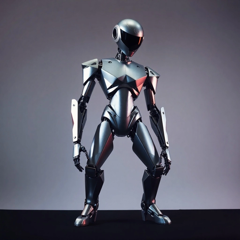 Avant-garde performance robot, abstract sculptural design, angular metallic body, iridescent chrome finish, theatrical pose, high-fashion runway cybernetic aesthetic, experimental art piece with dramatic lighting