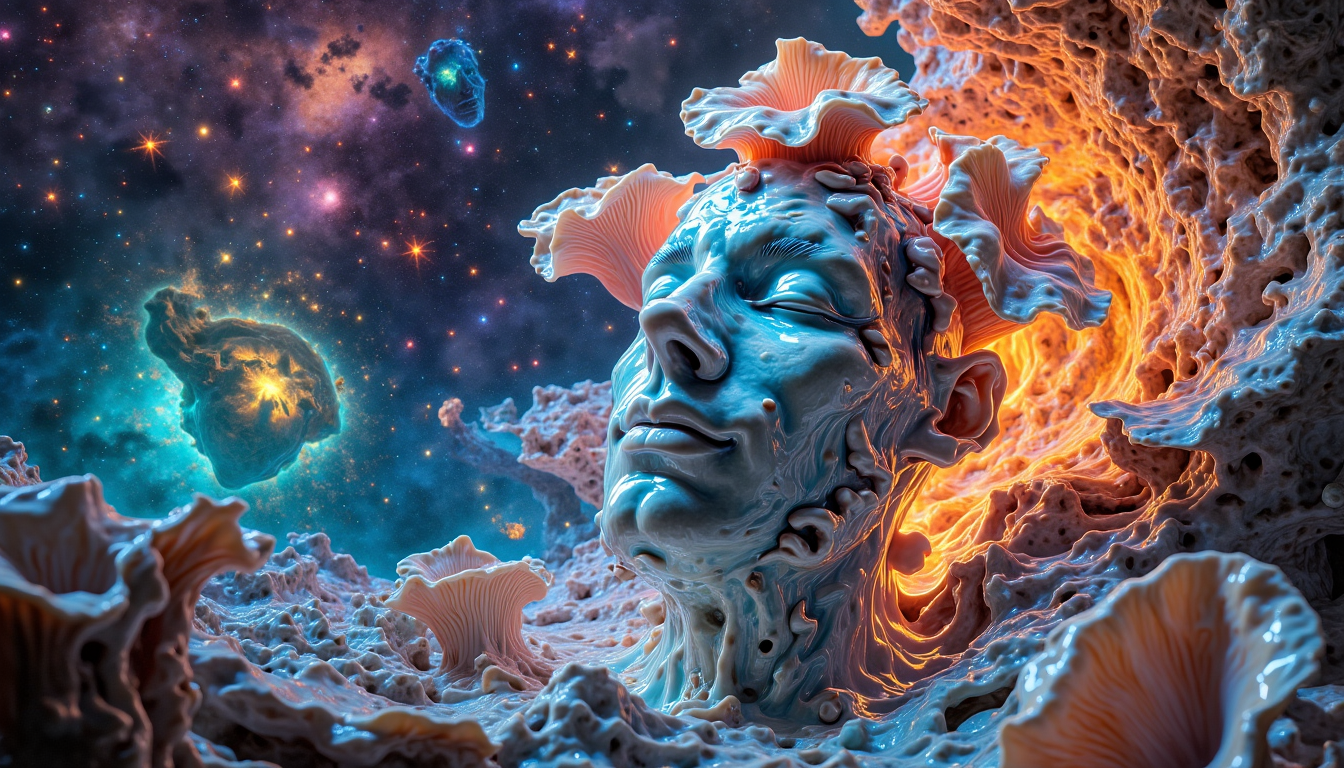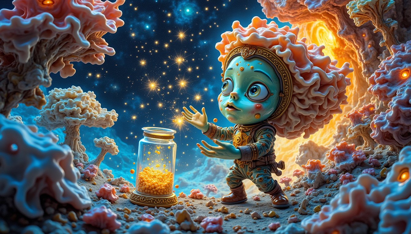 Mycos, the playful Little Martian scientist, reaching out with wonder-filled hands toward streams of glowing stardust in a cosmic laboratory setting. They hold an ornate glass jar catching shimmering stardust particles that glow like tiny stars. The scene has a surreal, organic aesthetic with flowing fungal forms, coral-like structures, and mushroom-inspired elements merged with cosmic space scenery. Rich blues, teals, oranges, and golden starlight create a dreamlike atmosphere with swirling nebulae in the background. Bioluminescent spores drift through the air around Mycos, creating trails of light. The overall style should be fantastical and organic, with smooth flowing forms reminiscent of both fungi and cosmic phenomena