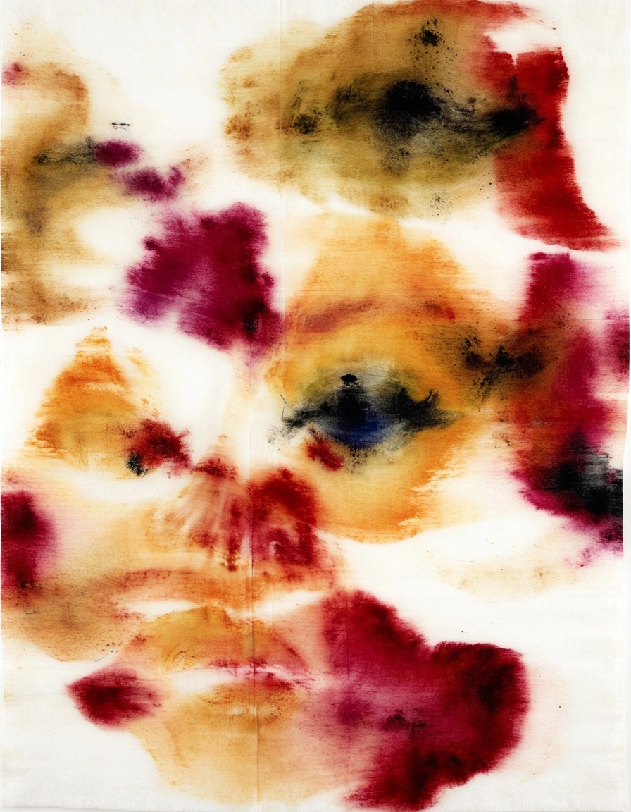 Saturated jewel tones collide with void. Rich violet floods meet lime-regal green ceremonial marks. Yves Klein blue bleeds into molten orange territories. Deep black absence carves negative space through chromatic intensity. Vibrant color saturation against stark emptiness.