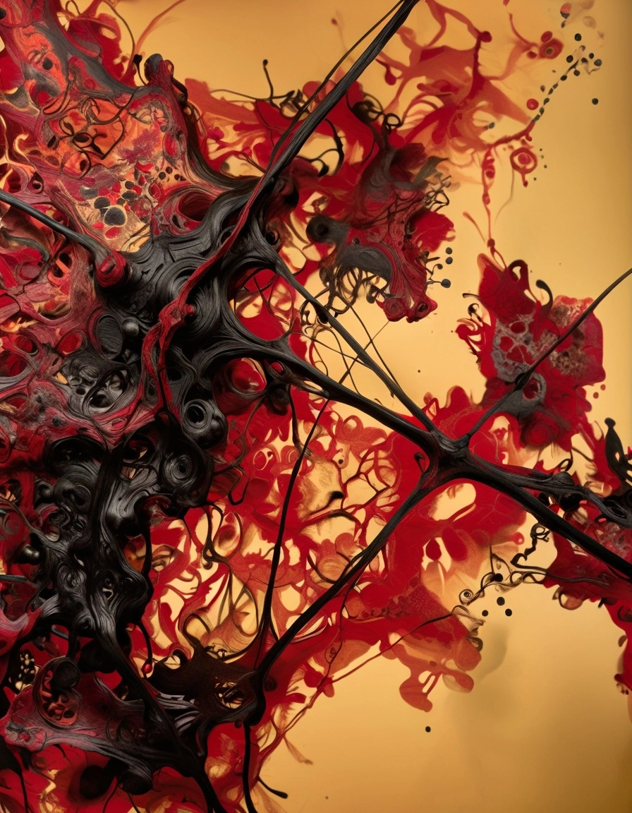Black hair strands suspended in translucent red vessel. Deep black filaments create dense tangles in lower region. Dark strands float through crimson medium. Ink-black hair preserves maximum darkness against red containment. Obsidian fibers maintain pure black saturation.