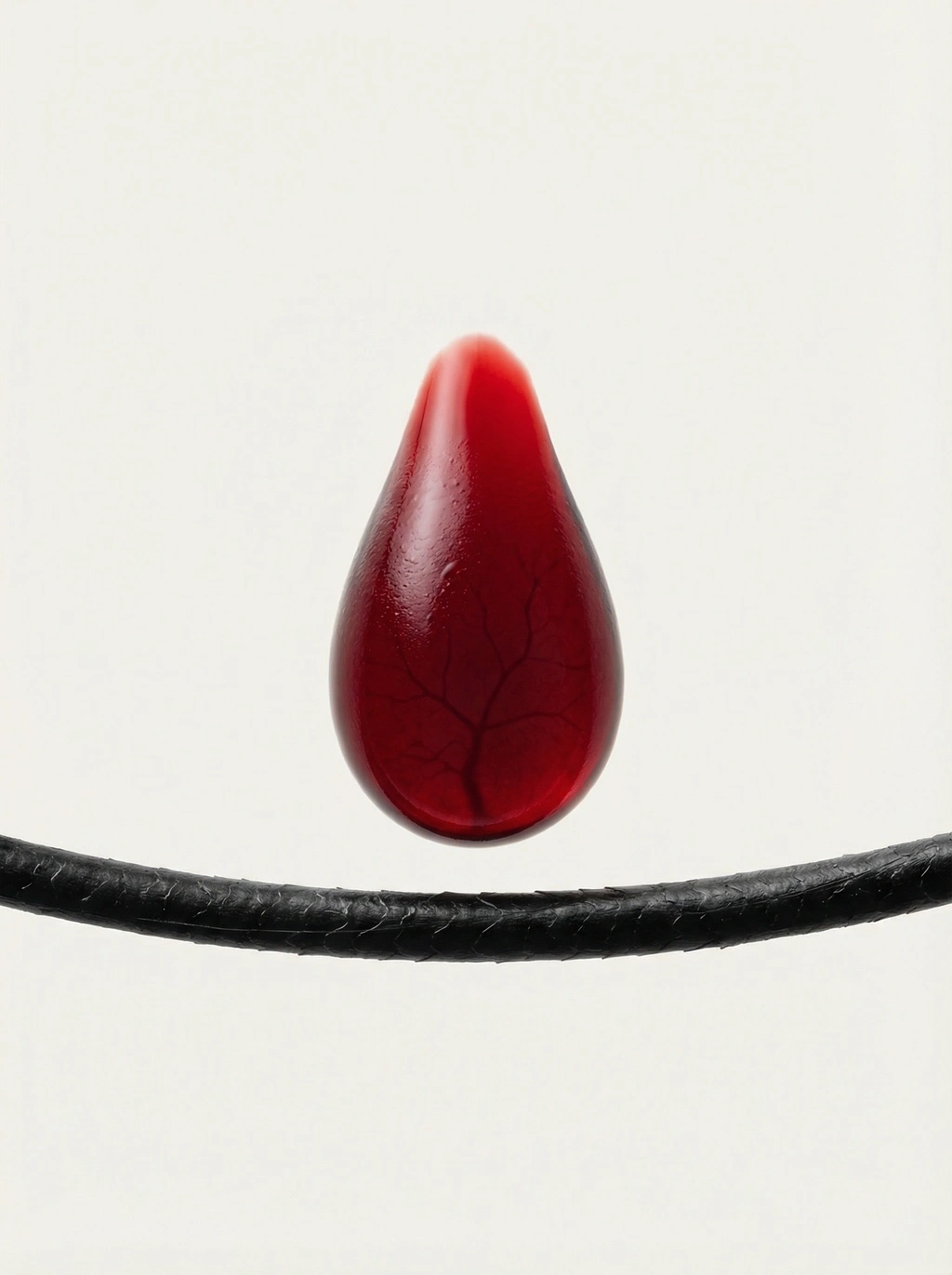 Brutally minimal blood-ceremony composition floating in bone-white void, single blood teardrop elongated organic form deep saturated crimson arterial-scarlet ruby-red photorealistic microscopic-scale biological-precision slick velvety surface glossy wet-sheen smooth liquid-membrane unified goosebump-texture raised-follicle-bumps surface-tension meniscus-curves, single real black-hair filament dense ink-black fine organic hair-structure natural texture visible microscopic hair-detail one bold horizontal line beneath blood-teardrop creating single graphic structural-gesture suspended-tension, delicate capillary-network visible as red-on-red filigree tree-like branching within translucent blood interior dual-layer visibility vascular-tree whisper-anatomy, maximum negative space void breathing hard Japanese ink-painting aesthetic one-stroke minimal restraint, high-contrast clean-composition essential-form only structural-necessity no decoration, vertical 3:4 frame, no text no labels no plaques no walls no floors, pure isolated brutally-minimal composition on bone-white void only cinematic-photorealism