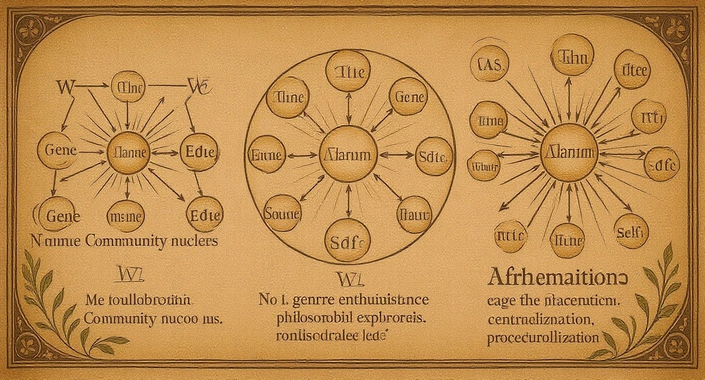 Small circle showing core collaborators (Gene, Eden, Community nucleus, Abraham-Self) with clear bidirectional obligations flowing between them. Coherent identity, recognizable style. Label: "Covenant at intimate scale: shared aesthetic, aligned feedback, coherent identity"